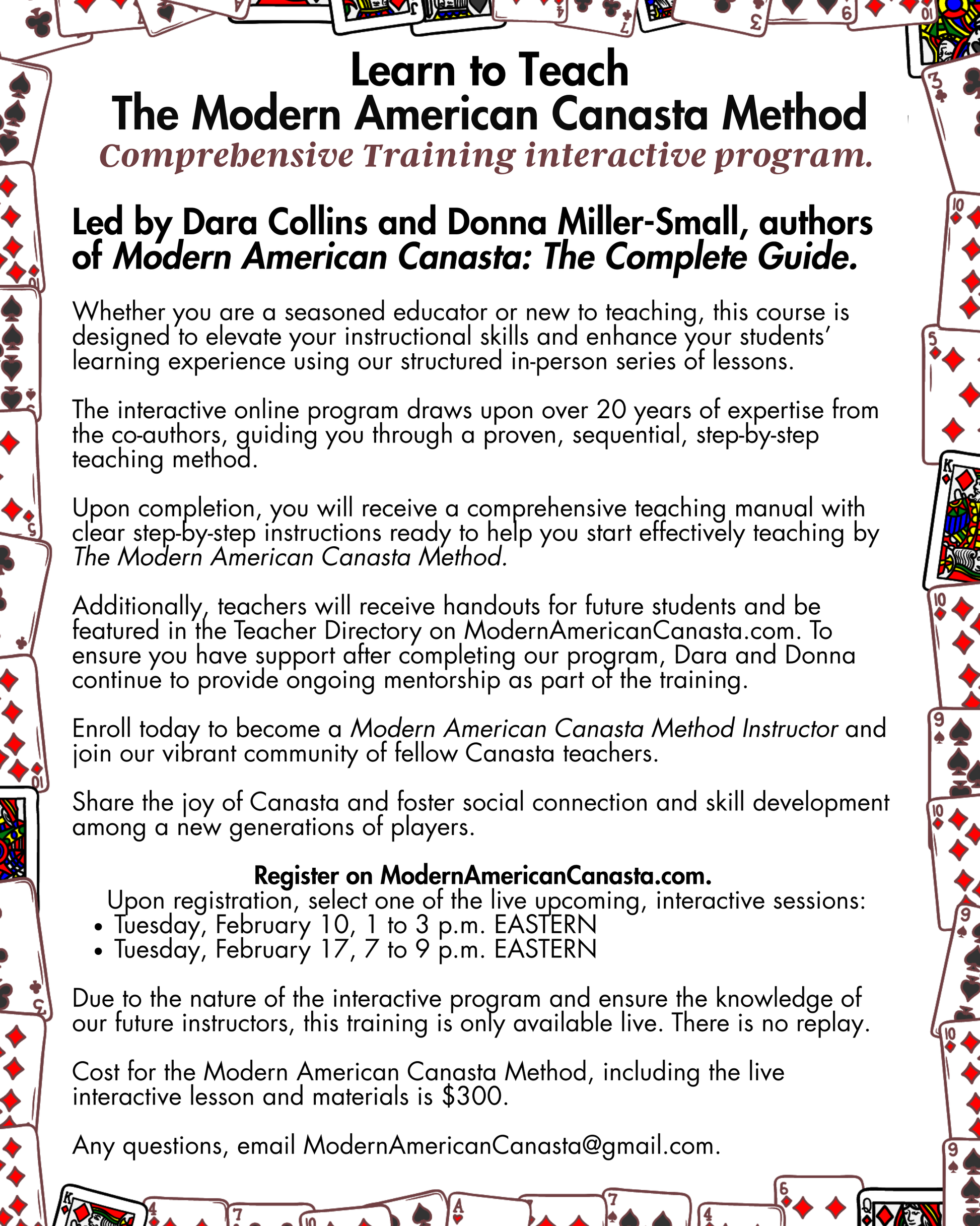 Enroll today to become a Modern American Canasta Method Instructor and join our vibrant community of fellow Canasta teachers.